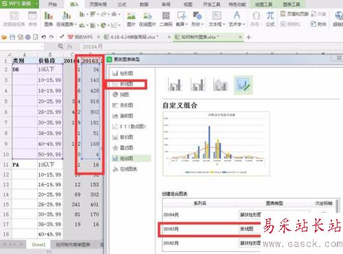 5、我在這里就選折線圖來呈現(xiàn)我們剛剛選的20163月的數(shù)據(jù)為第2種圖形,在原來柱形圖上選中數(shù)據(jù)右擊鼠標(biāo)選更改圖表類型這一項(xiàng)將3月的改為折線圖,如圖所示