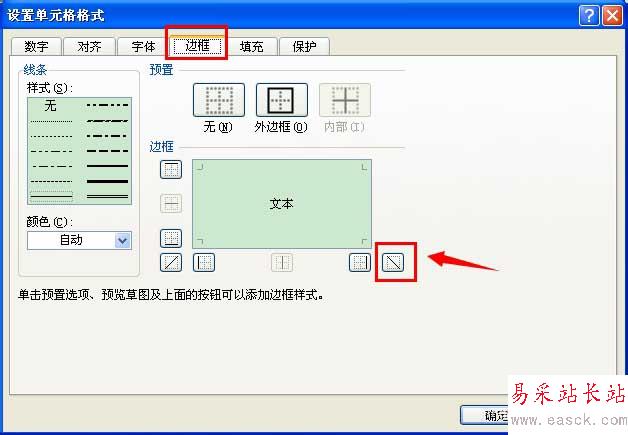3、在“設置單元格格式”里選擇“邊框”——紅色箭頭方框里的斜線標識。