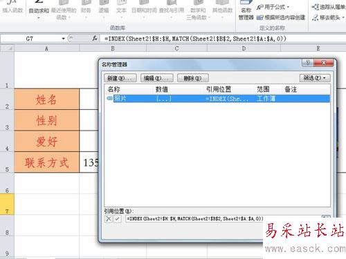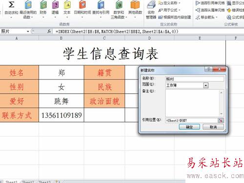 7、隨便找一個單元格輸入=INDEX(Sheet2!$H:$H,MATCH(Sheet1!$B$2,Sheet2!$A:$A,0)),執行菜單公式命令,從中找到定義名稱按鈕,在彈出的對話框中輸入名稱為照片,點擊確定按鈕。