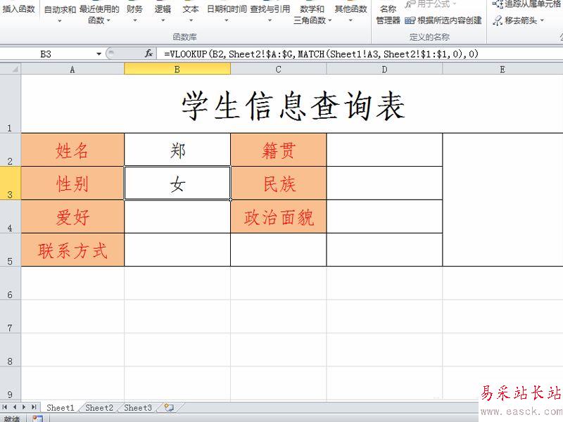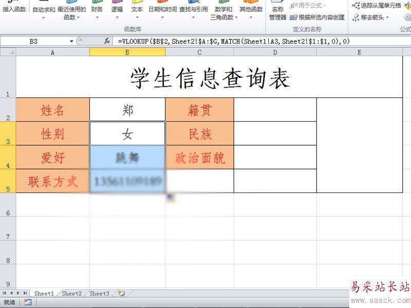 4、選擇單元格b3,輸入公式=VLOOKUP(B2,Sheet2!$A:$G,MATCH(Sheet1!A3,Sheet2!$1:$1,0),0)后,點擊確定按鈕,這個時候就會看到相應的信息了。