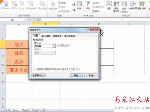 2、接著選擇單元b2,執行數據菜單命令,從中選擇數據有效性選項,彈出數據有效性對話框。