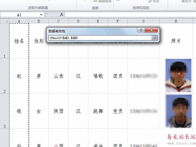3、切換到設置選項卡,允許設置為序列,點擊來源右下角彈出對話框,切換到sheet2,選擇姓名列,然后點擊確定按鈕。