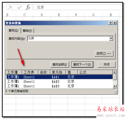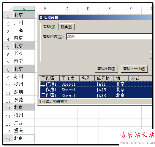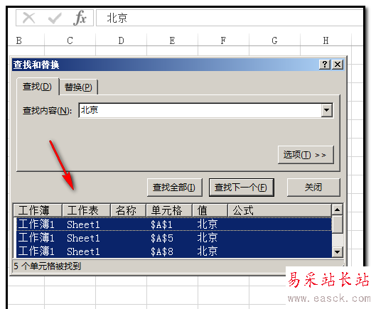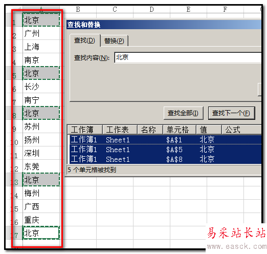 7、點(diǎn)“查找全部”后,查找框內(nèi)即顯示A列中所有“北京”的單元格;