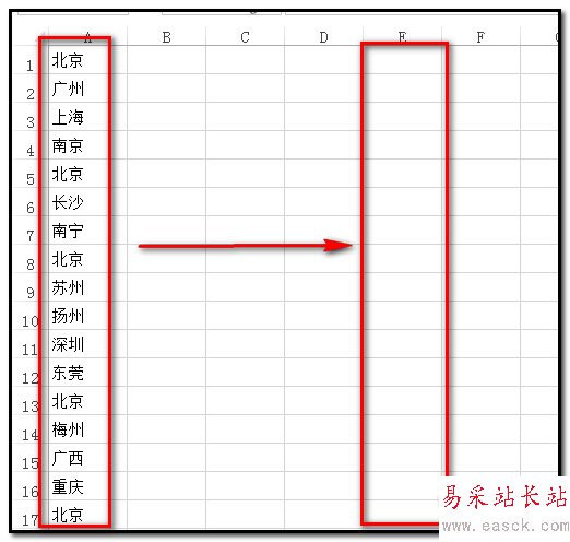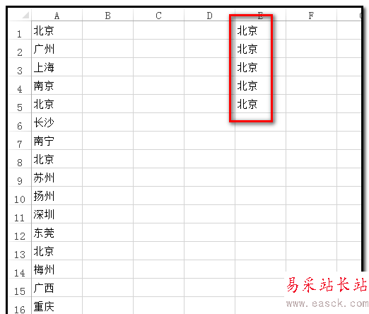 2、現(xiàn)在,把A1到A17單元格這些地區(qū)當(dāng)中把“北京”這個(gè)地區(qū)復(fù)制并粘貼到E列中。