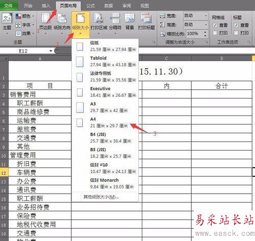 2、在excel中點(diǎn)擊“頁(yè)面布局”選項(xiàng)卡,點(diǎn)擊“紙張大小”,選擇“A4”,將紙張?jiān)O(shè)置為A4紙大小