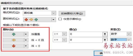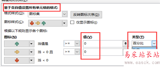 7、選擇“基于各自值設置單元格格式”,將值全部改為“0”,類型改為“數字”。解釋一下原因:如果想紅色表示下降,綠色表示上升,在數據層面,就是基于0的正負,>0表示上升,<0表示下降。如果選擇百分比,是都大于0的,沒有意義。