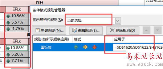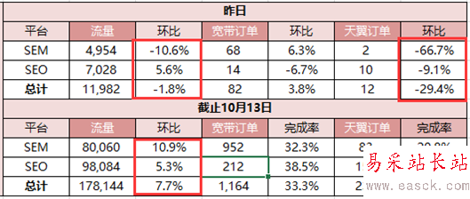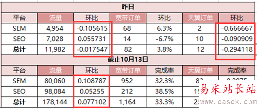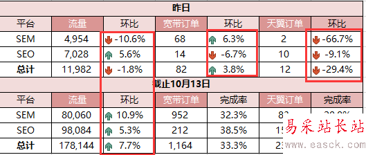 8、這些數據設置好以后圖標就能正常的顯示表示上升、下降。環比的昨日的數據就會一目了然。紅色還能有警醒作用。