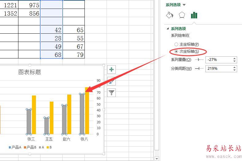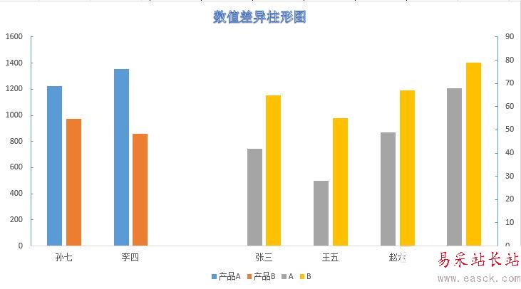 在excel圖表中,如果表格的兩組數(shù)據(jù)值差異很大,那么制作出的圖表就無法顯示出小數(shù)值的字段列內(nèi)容,這時就需要制作數(shù)值差異柱形圖。