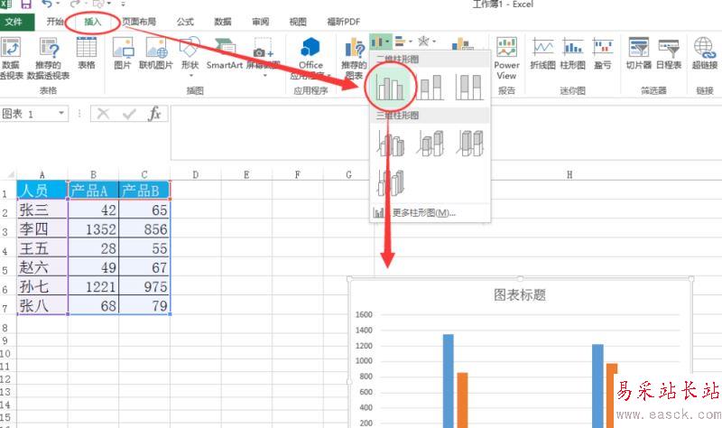 2、選中表格數(shù)據(jù)內(nèi)容區(qū)域,然后點擊【插入】面板中的一種圖表樣式,在窗口中生成柱形圖圖表,如下圖。