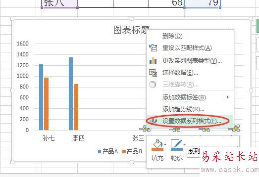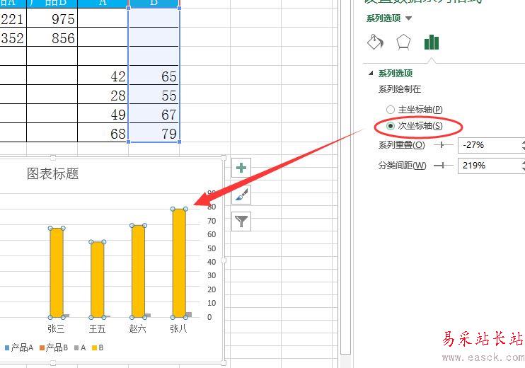 5、選中數(shù)據(jù)值小的柱形圖形,點擊鼠標右鍵,然后選擇設(shè)置數(shù)據(jù)系列格式,在右側(cè)面板中點擊選擇【次坐標軸】。
