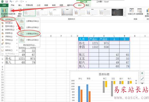 6、點擊頂部菜單中的【設(shè)計】,然后選擇【添加顏色圖表】-【坐標軸】-【次要橫坐標軸】.