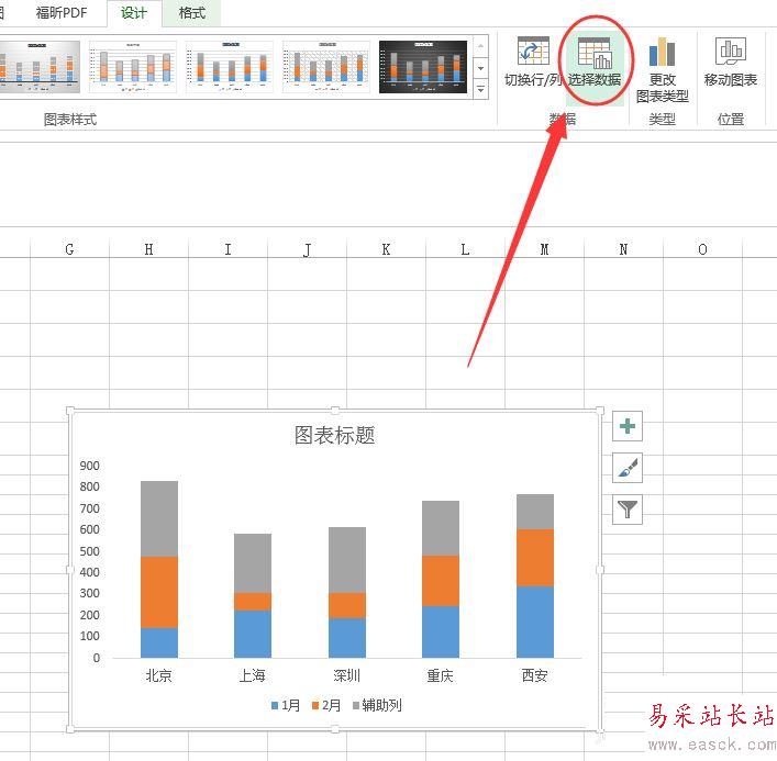 4、刪除圖例文字,選中圖表,點擊面板的【選擇數據】,在對話框中將輔助列上移一位,點擊確定。