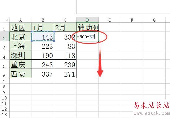 2、首先在excel中建立一個數據表,然后增加一個輔助列,為了使將來建立的兩個柱形圖有一定的間距,設置單元格內容為=500-B2,然后快速向下填充。