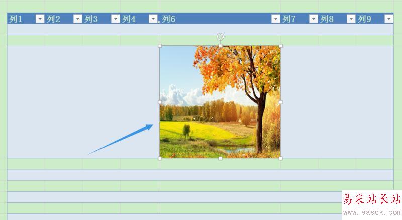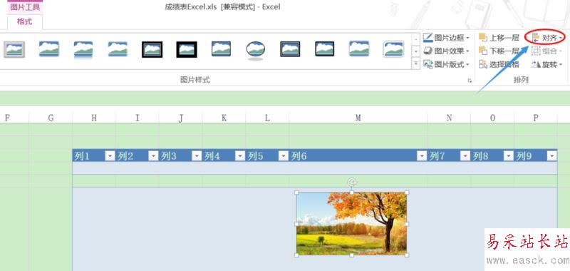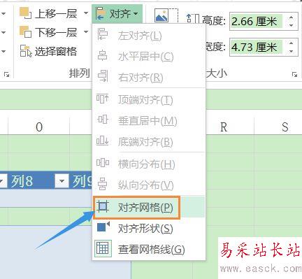 5、點擊對齊右側的下拉按鈕,然后選擇"對齊網格",為了便于大家觀察效果,我們可以先將圖片拖動的和單元格大小匹配,如下圖所示;