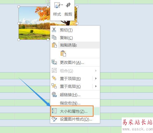 2、為了其能夠隨著單元格改變,此時首先點擊該圖片然后右鍵"大小和屬性",如下圖;然后在右側彈出的窗口里點擊"屬性";