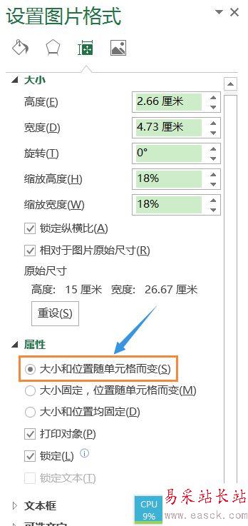 3、在屬性選項,我們勾選"大小和位置隨單元格而變",然后將此窗口關閉,不過這樣還是不行的...