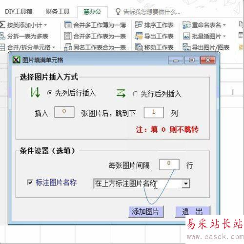 5、第5步:彈出對話框,選擇每隔0行插入,且圖片的標題位于圖片上方,如下圖所示: