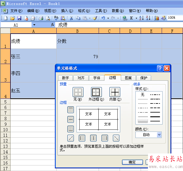 6、我們可以看到“無”、“外邊框”、“內部”三個選擇,根據我們的需要,我們需要點擊“外邊框”和“內部”兩個欄。