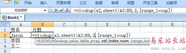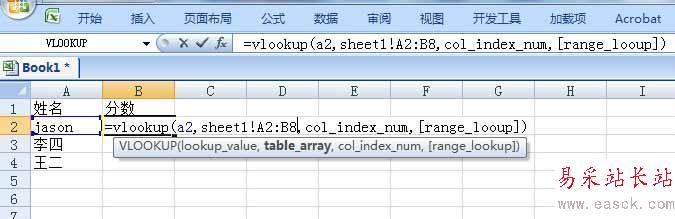 這里有一個重要提示:參數二的區域范圍一定是從要查找的值所在的列開始,比如案例中姓名在數據源中位于A列,所以我們的范圍是A2:B8,如果姓名在B列,成績在C列,那么我們的范圍就必須是B2:C8,而不能是A2:C8。