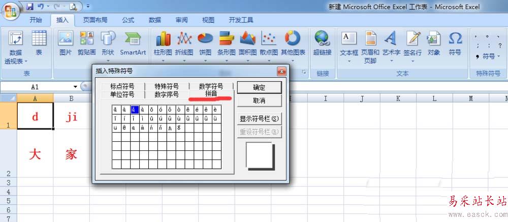 6、雙擊文字對(duì)應(yīng)的拼音單元格,讓鼠標(biāo)定向在要插入的音調(diào)地方(雙擊之后,此處會(huì)閃),插入音調(diào),確定即可。