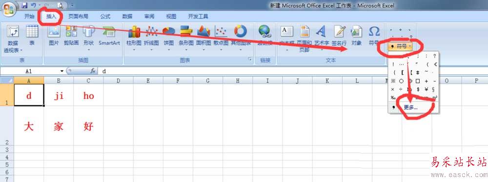 4、在 Excel 上方工具欄項(xiàng)找到插入”插入”欄中的“符號(hào)”;然后點(diǎn)擊符號(hào)里面的“更多”。