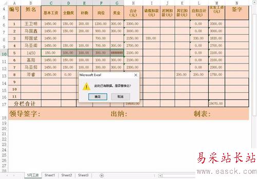 4、或者是選擇好數(shù)據(jù)范圍后,直接在邊框處按住鼠標(biāo)左鍵拖動(dòng),放開后選擇覆蓋當(dāng)前單元格數(shù)據(jù)即可。如圖所示: