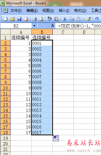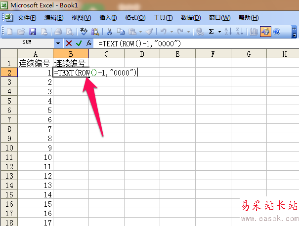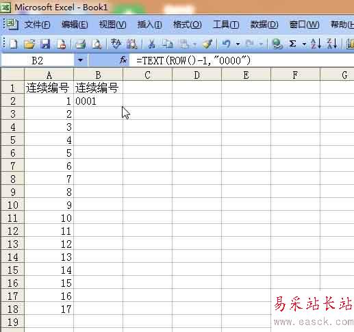 在B2單元格輸入“=TEXT(ROW()-1,"0000"),按 Enter回車確認輸入。