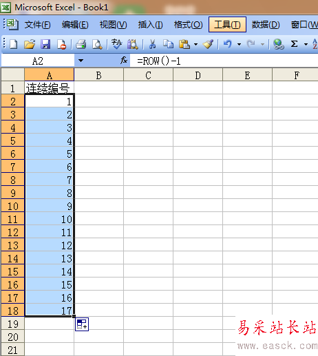 給 Excel電子表格建立編號,我們常用數據填充或都輸入一個首號往下拉填充,如果我們的名單或者數據的某一行被刪除了,那么對應的編號也就刪除了,編號就不連續了,怎么創建一個連續的編號呢?下面小編介紹一下方法。