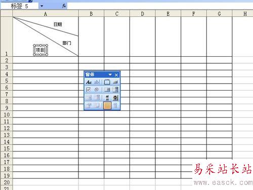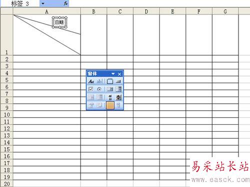 4、選擇窗體里標簽控件,然后在單元格第一欄中點擊一下創(chuàng)建了一個標簽,修改標簽的內(nèi)容為“日期”。