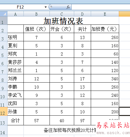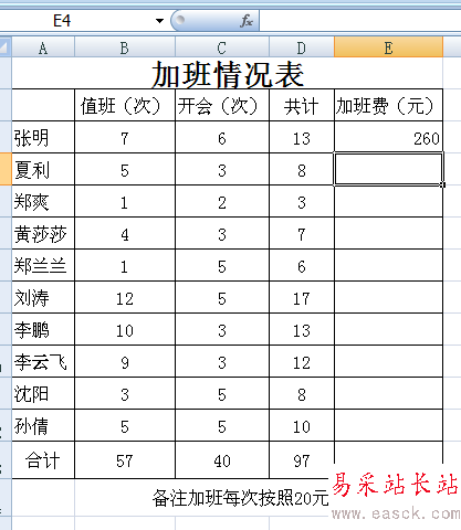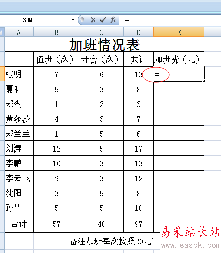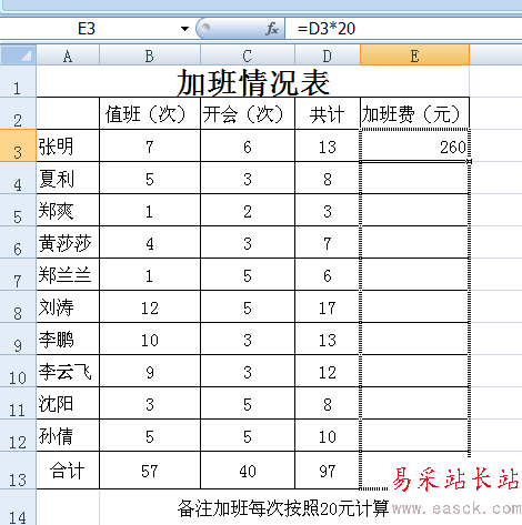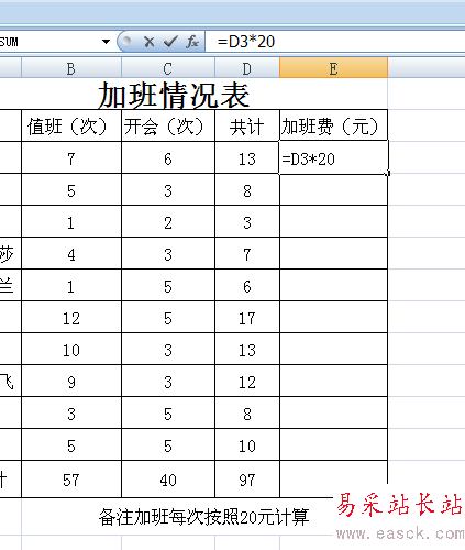 1、我們現在看如圖所示的,要求的E列的結果,看到表格的下方給到提示,每次加班費按照20元每次計算,所以我們大致可以知道用D列乘以20就是E列的結果了。