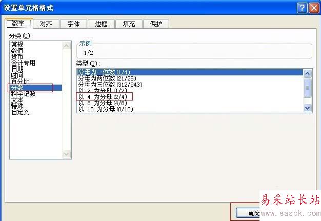 7、進來之后,我們選擇數字,分數,然后在類型里選擇以4為分母,確定即可