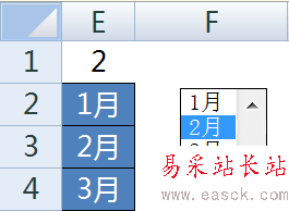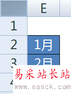 4、在E2:E4輸入原始數據各月份的標題,本例是1月、2月和3月。