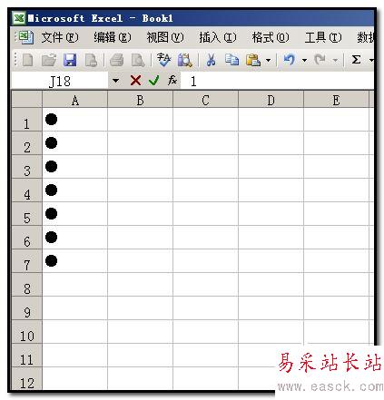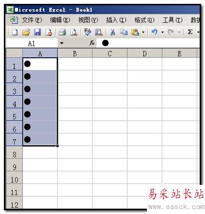 6、然后,光標點下A1單元格,光標再移到單元格右下角,光標變成黑色+字時,點住不放手,一直拖到A7單元格再放開鼠標。這里,A2到A7單元格即被填充上了“ ●”符號。如下圖所示。