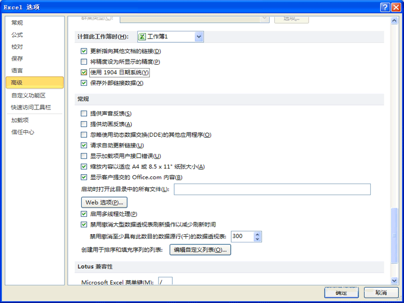 2、接著彈出excel選項對話框,在該對話框中選擇高級選項,勾選使用1904日期系統,點擊確定按鈕。