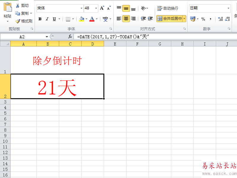 6、選擇數據區域a1:d1,執行合并單元格命令,輸入文字內容“除夕倒計時“,