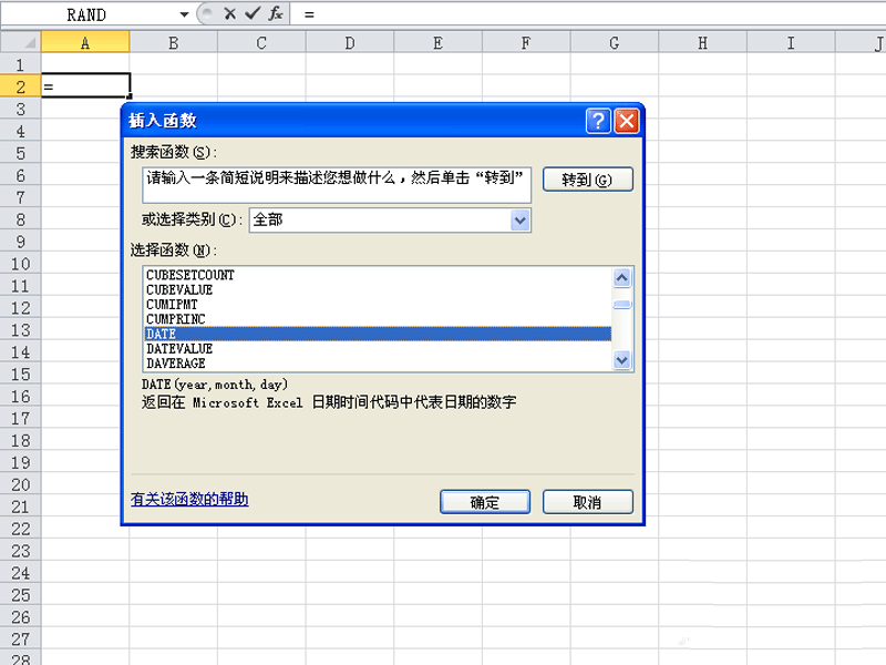 3、選擇單元格b2,執行插入-函數命令,選擇函數為date函數,點擊確定按鈕。