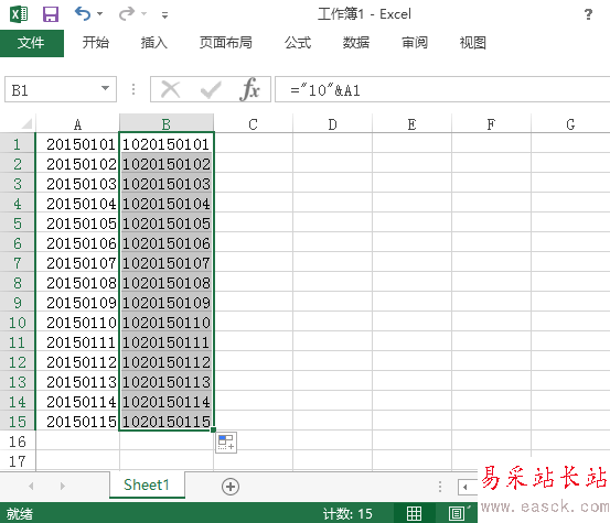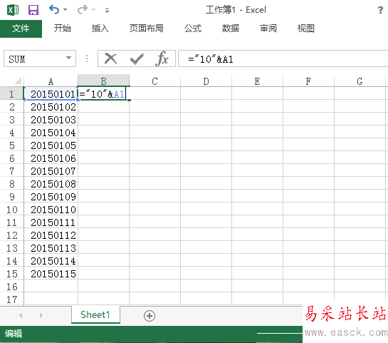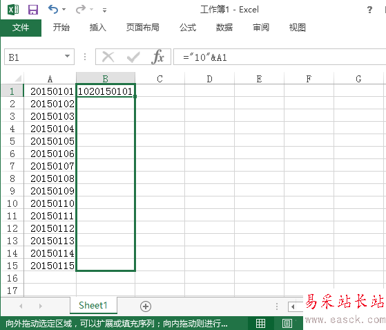 2、在B1單元格中輸入 ="10"&A1,注意在半角、英文狀態(tài)下輸入,10代表需要添加的字符,A1代表相應(yīng)的單元格,輸入完成后,點擊回車,結(jié)果如圖所示。