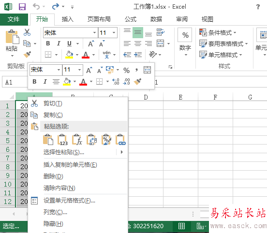 5、在A列上單擊鼠標(biāo)右鍵,“粘貼選項”選擇”值“,將B列數(shù)據(jù)以值的形式粘貼到A列。刪除B列即可。