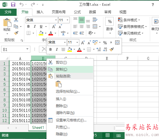 4、鼠標(biāo)在B列上單擊右鍵,選擇復(fù)制。