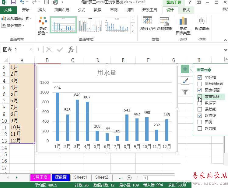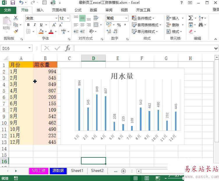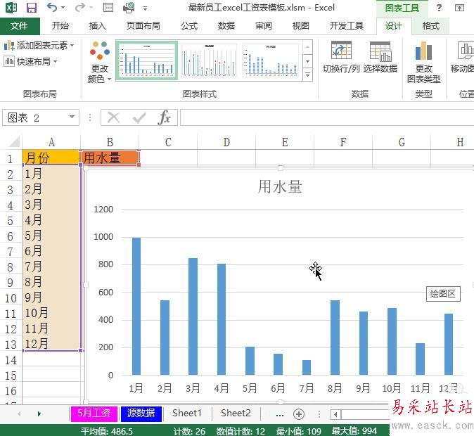 excel設置查看一年內水費的用量柱狀圖