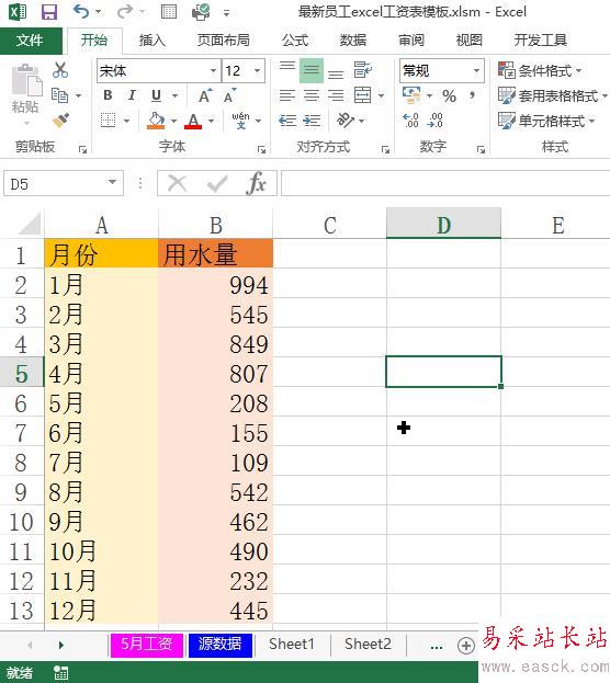 2、在工作表中輸入該年度的用水量數據,標題欄處于第一列,格式如圖所示: