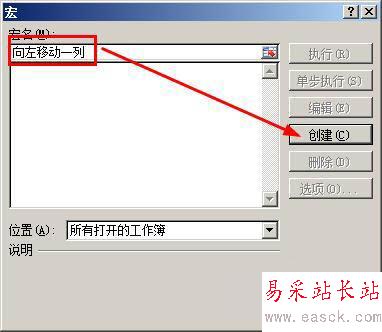 2、打開了宏對話框,我們填寫宏名為【向左移動一列】,然后點擊【創建】按鈕。