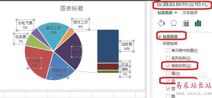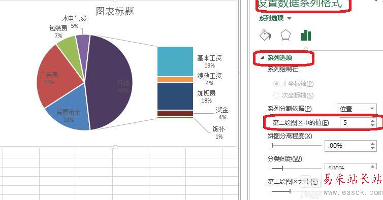 5、設置數據系列格式——系列選項——第二繪圖區中的值。由于人工費用中有5個小類別。