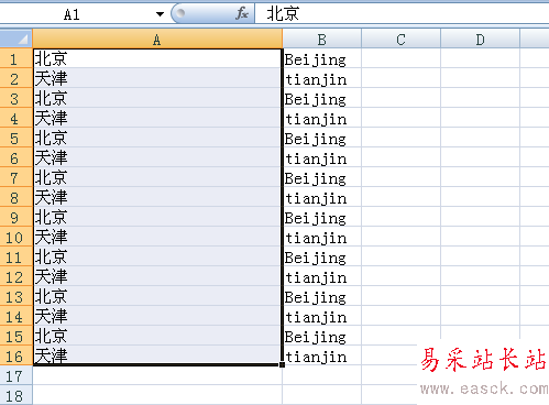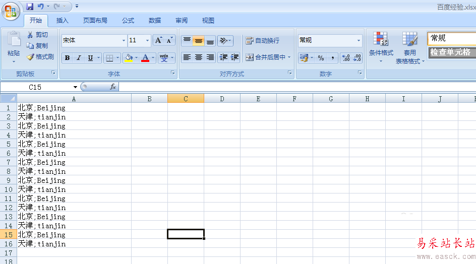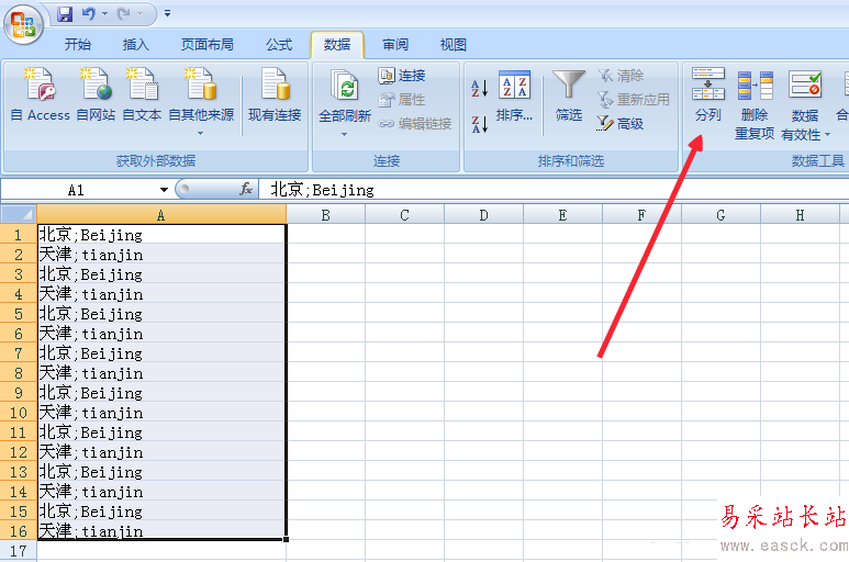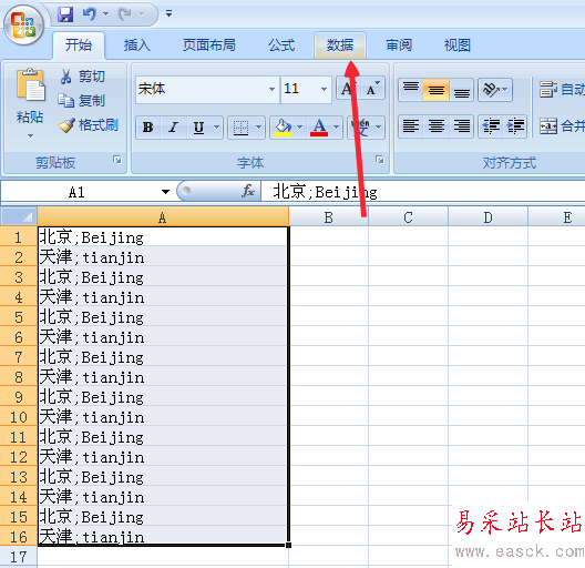 5、我們在表格中輸入我們的數據,例如北京;beijing,我們發現這兩個應該是分開的,分開兩個單元格,數量少我們可以一個個弄,大量數據我們怎么辦,這里就教大家分列,順便大家看一下上邊的名稱也變了。