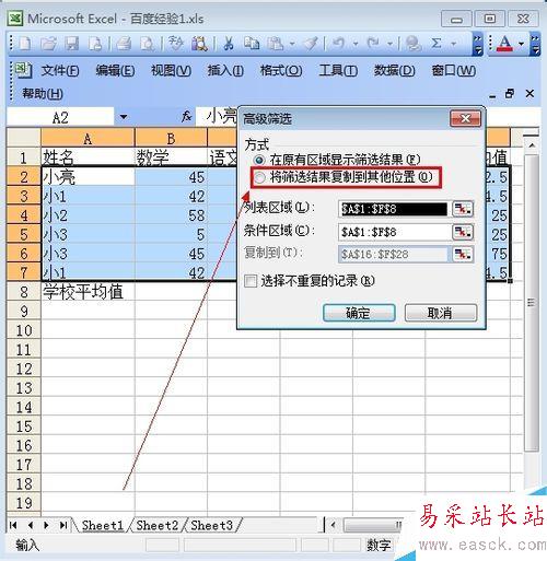 6、在彈出的高級刷選窗口里點擊“將刷選結果復制到其他位置” 如圖