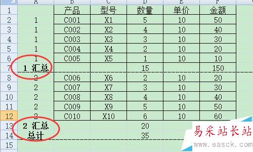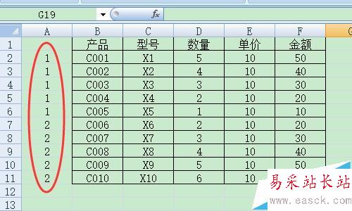 2、使用A列作為輔助列,我們分開匯總1到5產品和6到10產品。在A列輸入數據如圖。