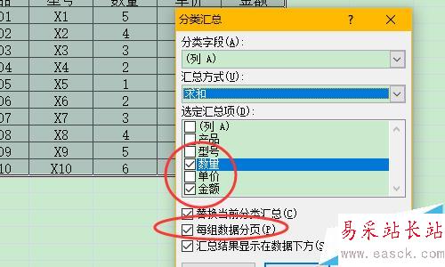 4、分類匯總窗口中,分類字段我們選擇列A,匯總方式:求和,匯總項選擇數量和金額,并勾選每組數據分頁。