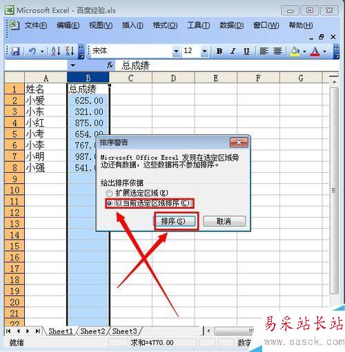 6、在排序警告窗口中,勾選“以當前選定區域排序”,然后點擊“排序” 如圖