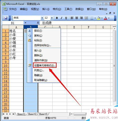2、選擇要排序的列,然后在右鍵此列,并且點擊“設置單元格格式” 如圖