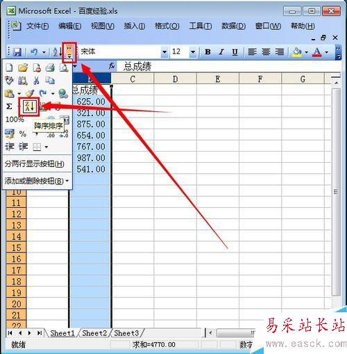 5、然后點擊菜單欄中的倒三角符號,在里面找到排序功能 ,并且點擊,這里有降序排序和升序排序,這個要根據大家的選擇 如圖